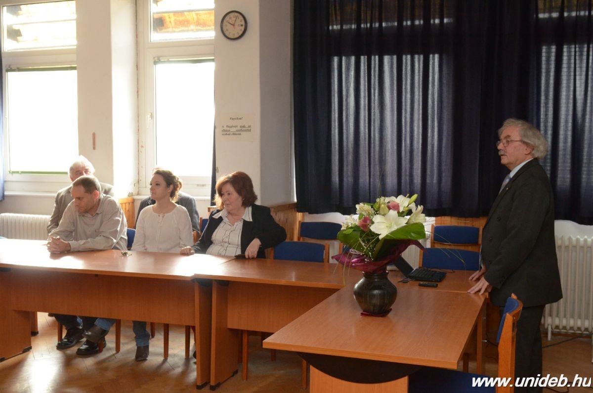 A professzor emeritust a Debreceni Egyetem vezetése nevében Varga Zsolt tudományos igazgató köszöntötte, aki maga is vegyészként végzett, s méltatásában felidézte a régi barátság kezdetét.