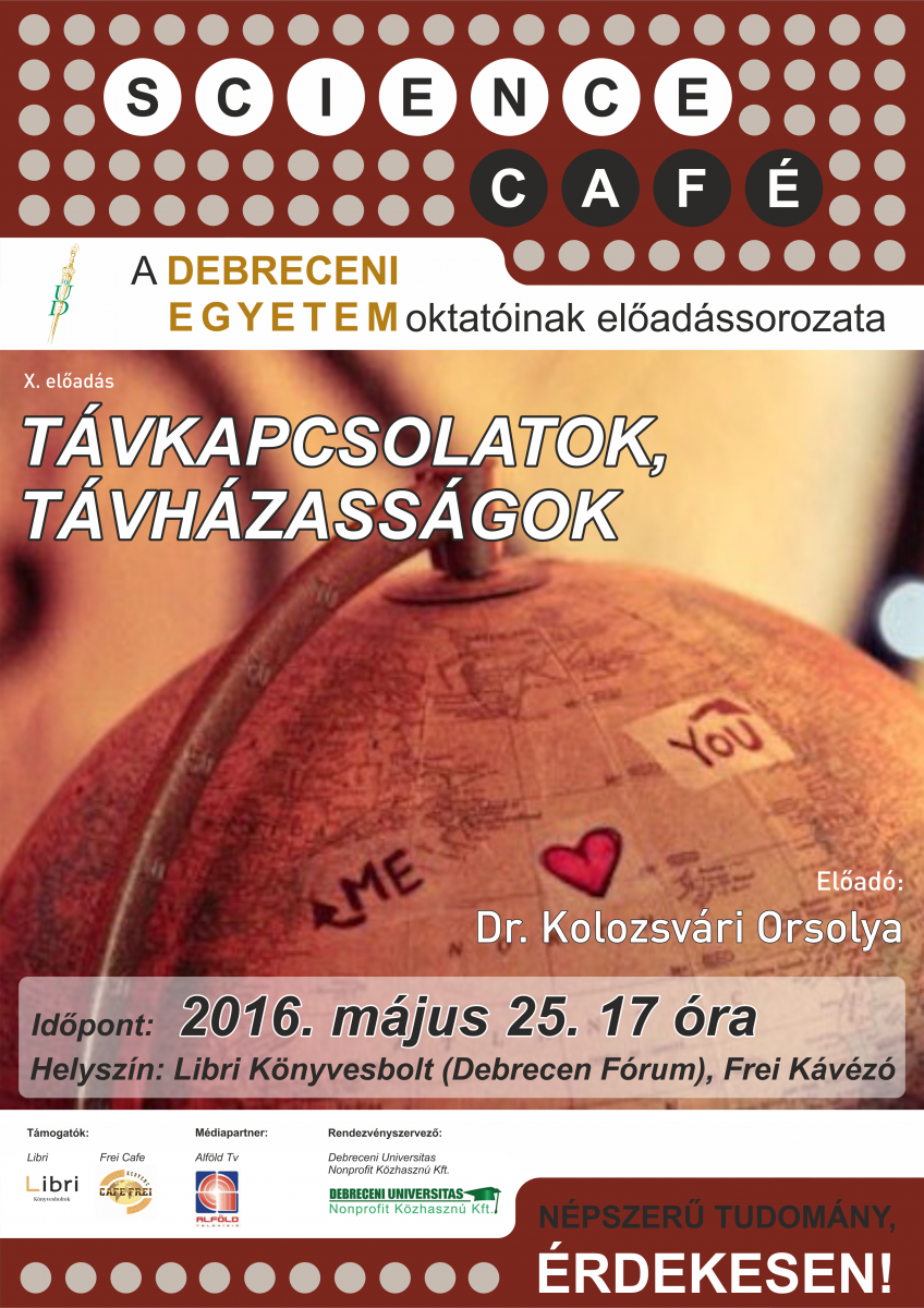 A távkapcsolatok, a távházasság problematikájával foglalkozik az egyetem tudományos ismeretterjesztő sorozata, a Science Café szezonzáró előadása.