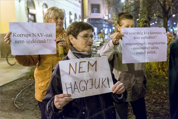 A közfelháborodás napja címmel meghirdetett tüntetés résztvevői transzparensekkel a debreceni régi városháza előtt 2014. november 17-én. MTI, fotó: Czeglédi Zsolt