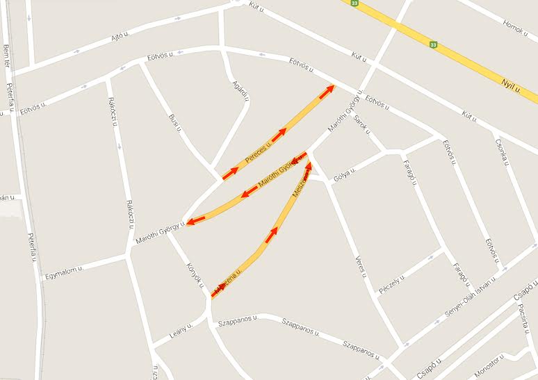 - A Maróthi György utca – Veres utca – és Pereces utca közötti szakaszán egyirányúsítják a forgalmat a Veres utca irányából a Pereces utca irányába.