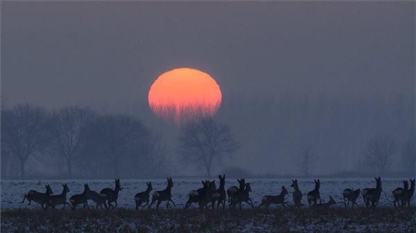 Őzek (Capreolus capreolus) a havas szántóföldön naplementekor Nagyhegyes közelében 2017. január 20-án. MTI Fotó: Czeglédi Zsolt