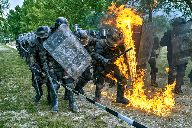 Szakadó esőben is sikeresen zajlott a katonák missziós felkészülésének egyik legismertebb mozzanata, a tömegkezelési feladat. Az imitált szituáció szerint a sokszor elismételt felszólításoknak a hőzöngők nem tettek eleget – sőt egy csoportjuk rá is támadt a KFOR-erők sorfalára -, ezért a katonák parancsot kaptak az oszlatásra. A békefenntartók munkáját a feléjük dobált tárgyak is nehezítették, ráadásul a tüntetők felgyújtották a barikádokat, sőt Molotov-koktélokat dobáltak a katonák felé. A békefenntartók azonban végül végrehajtották a feladatukat és feloszlatták a tüntetőket.