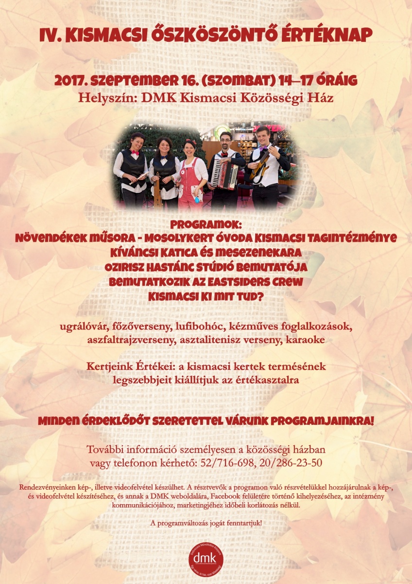 Szeptember 16-án, szombaton, 14–17 óráig immár negyedik alkalommal szervezik meg a Kismacsi Őszköszöntő Értéknapot a Debreceni Művelődési Központ Kismacsi Közösségi Házában (Debrecen – Kismacs, Napraforgó u. 16.). Az értékasztalra kiállítják a kismacsi kertek terméseinek legjavát. Műsort adnak a Mosolykert Óvoda Kismacsi Tagintézményének növendékei, a Kíváncsi Katica és mesezenekara, az Ozirisz Hastánc Stúdió, és az Eastsiders Crew.