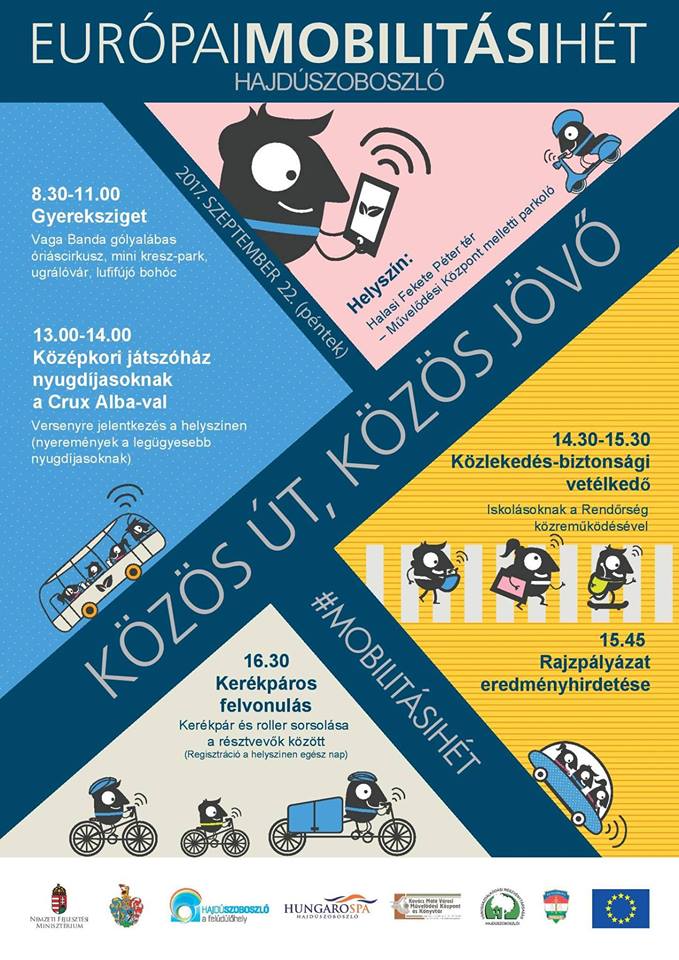 Az Európai Mobilitási Hét és Autómentes Nap alkalmából 2017. szeptember 22-én változatos programok várják az érdeklődőket Hajdúszoboszlón. Az idei év mottója: „Közös út, közös jövő”. Témája: tiszta, közösségi és intelligens mobilitás.
