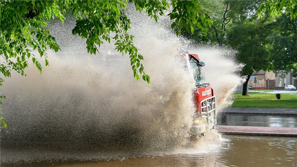 Tűzoltó szakadó eső után leszakadt faágat vág el motoros láncfűrésszel a debreceni Dobsina utcában 2018. május 27-én. Fotó: Czeglédi Zsolt / MTI