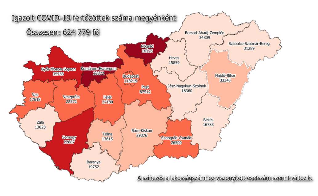 A kormányzati portálon azt írták: 624 779-re nőtt a Magyarországon azonosított fertőzöttek száma. Az elhunytaké 19 752-re emelkedett, a gyógyultak száma 393 999.
