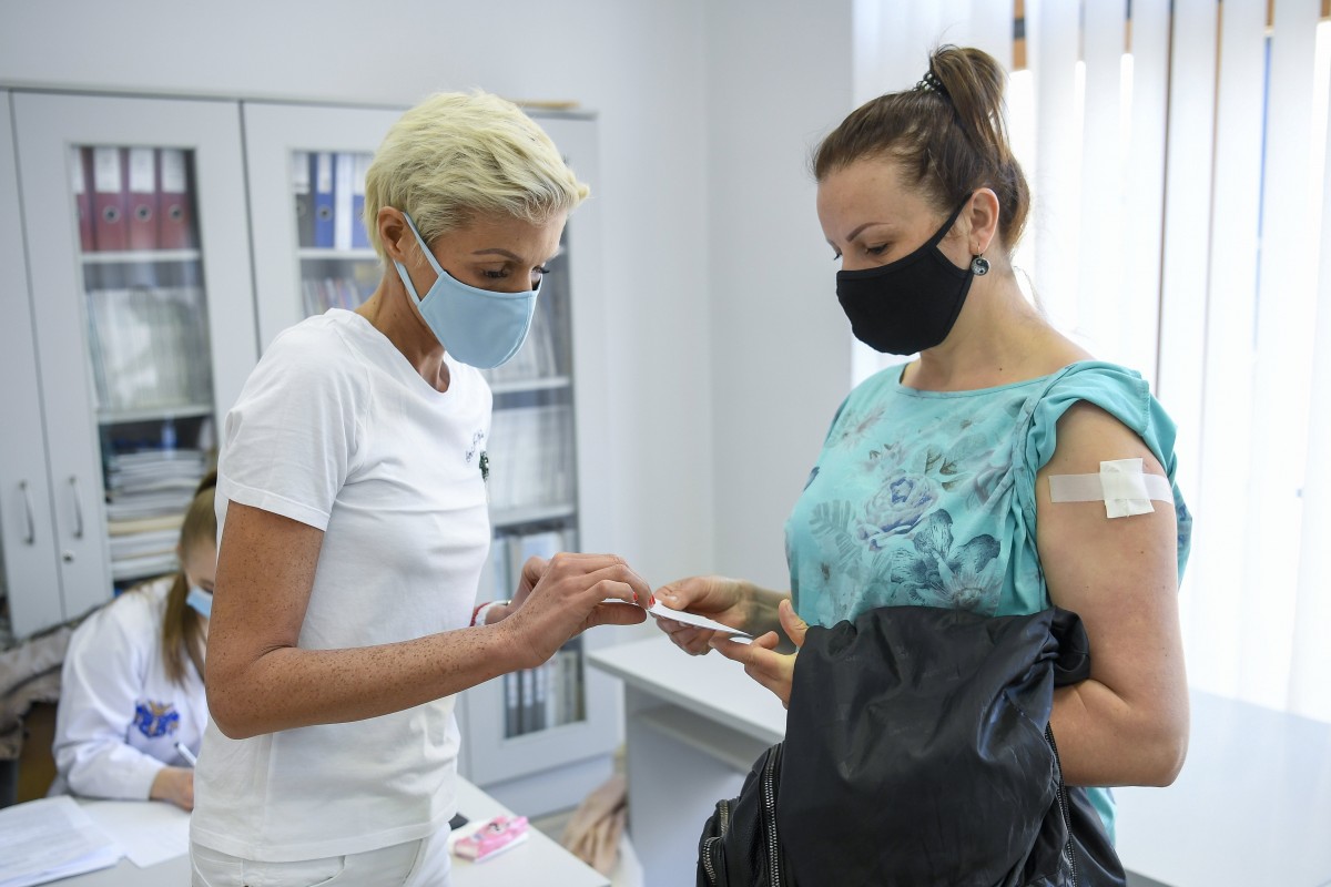 Fotó: Egy nő átveszi oltási igazolását, miután megkapta a német-amerikai Pfizer-BioNTech koronavírus elleni oltóanyag, a Comirnaty-vakcina első adagját a Debreceni Egyetem Klinikai Központ Nagyerdei Campus Belgyógyászati Klinikáján kialakított oltóponton 2021. április 11-én. Ezen a napon a pedagógusok és köznevelésben dolgozók kaptak oltást. MTI/Czeglédi Zsolt