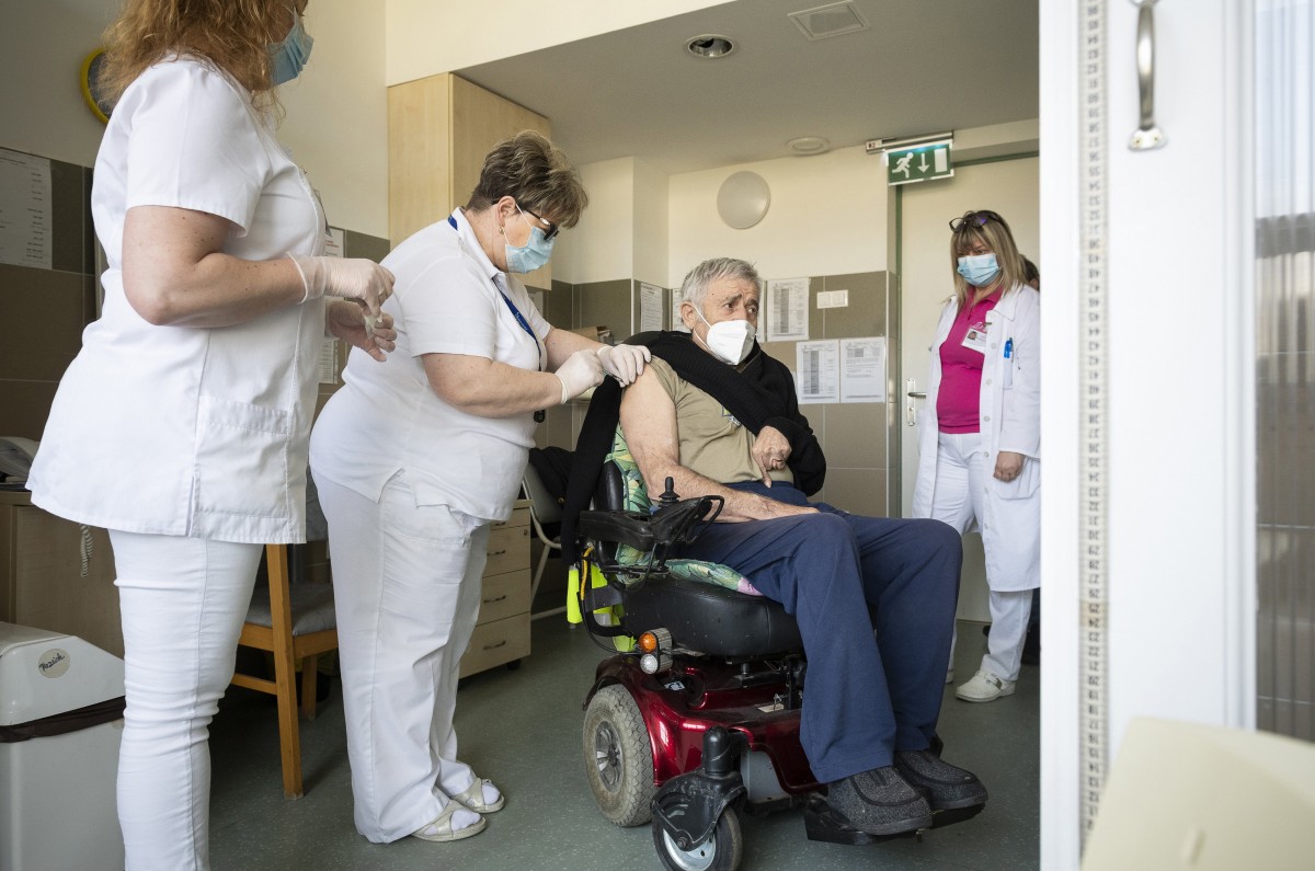 Nagyné Bányai Mária szemész főorvos beolt egy férfit a német-amerikai fejlesztésű Pfizer-BioNTech koronavírus elleni vakcina második adagjával a Szabolcs- Szatmár-Bereg Megyei Kórházak és Egyetemi Oktatókórház nyírbátori szakrendelőjében kialakított oltóponton 2021. április 23-án.