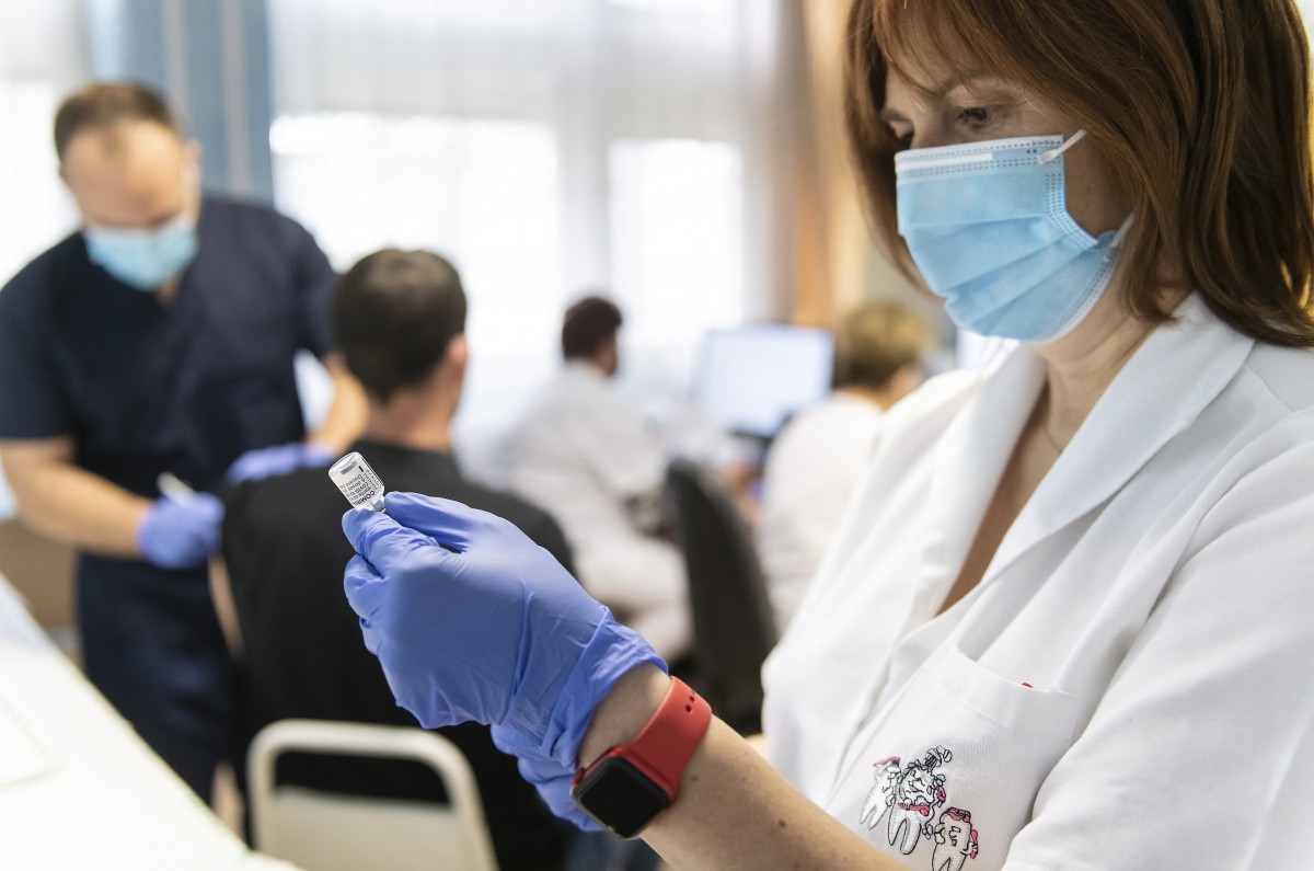 Balázsi Andrea asszisztens előkészíti a német-amerikai fejlesztésű Pfizer-BioNTech koronavírus elleni oltóanyagot, a Comirnaty-vakcinát a Jósa András Oktatókórházban kialakított oltóponton Nyíregyházán 2021. május 23-án.