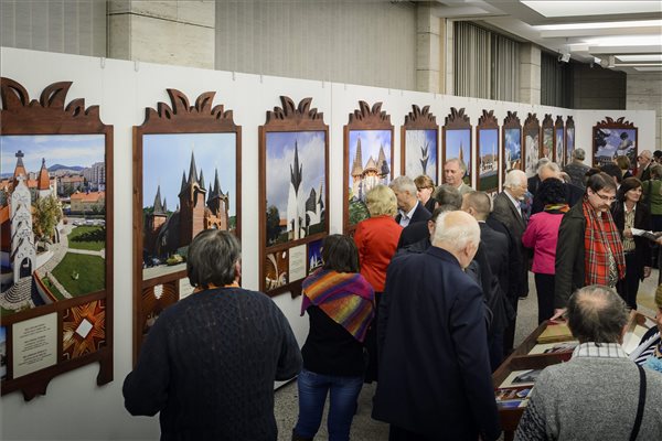 Érdeklődők Makovecz Imre Kossuth-díjas építész “..összekötni az eget és a földet..” című, a művész életművét reprezentáló tárlat megnyitóján a magyar kultúra napján a Kölcsey Központban, Debrecenben 2015. január 22-én. Fotó: Czeglédi Zsolt / MTI