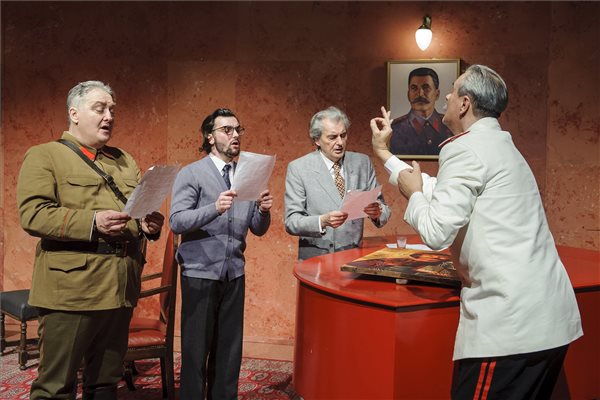 Jámbor József (b) Zsdanov, Rózsa László (b2) Sosztakovics, Csikos Sándor (b3) Prokofjev és Szalma Tamás (j) Sztálin szerepében a Mesterkurzus című előadás próbáján a debreceni Csokonai Nemzeti Színház Horváth Árpád Stúdiószínházában 2017. február 16-án. A David Pownall rádiójátékból készült darabot Pinczés István rendezésében február 17-én mutatják be. MTI Fotó: Czeglédi Zsolt