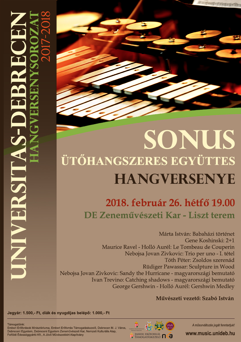 Szeretettel várnak mindenkit az Universitas-Debrecen következő hangversenyér február 26-án hétfőn 19.00 órakor a Debreceni Egyetem Zeneművészeti Kar Liszt termében, ahol a SONUS ÜTŐHANGSZERES EGYÜTTES HANGVERSENYÉT hallhatják.