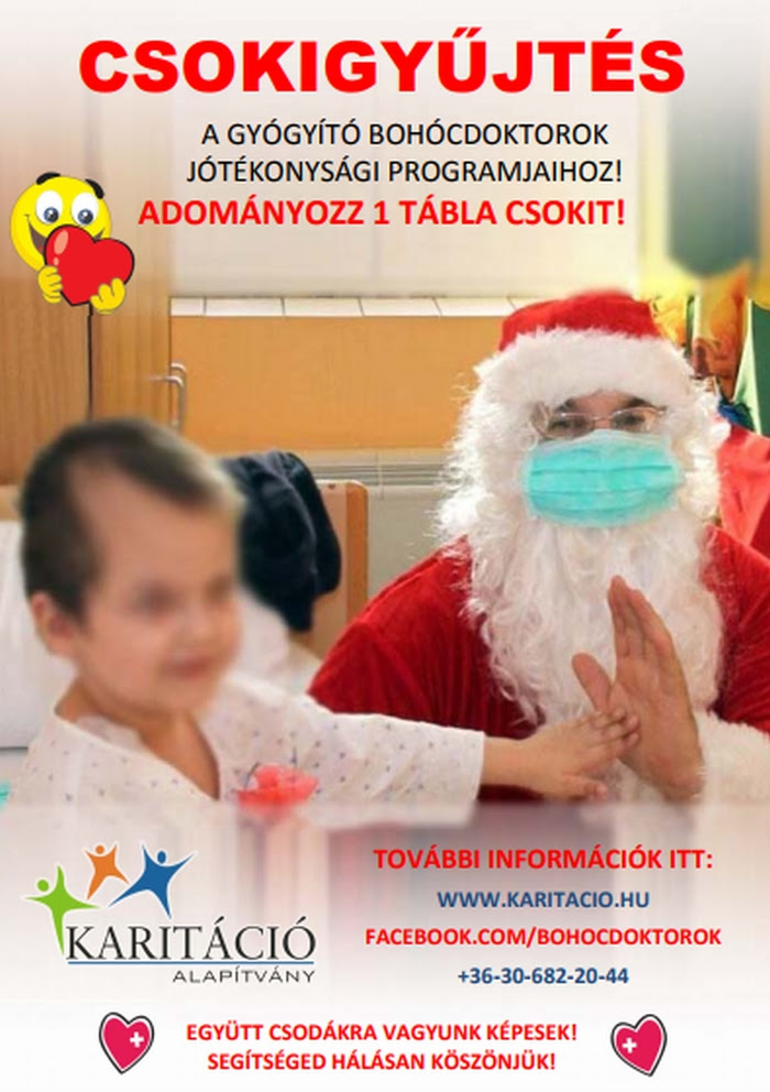 Egy – egy tábla csokival lehet támogatni a Karitáció Alapítvány bohócdoktorainak gyógyítást segítő tevékenységét. Az alapítvány közösen más szervezetekkel idén is 1000 gyermek ünnepét teszi boldoggá, hiszen az alapítványi Mikulás ezer gyermeknek ad idén is teletömött Mikulás csomagot. A jótékonysági akciót bővebben a www.karitacio.hu oldalon lehet megismerni! Szülők, nagyszülők és a cégek üzemeltetőit is együttműködésre hívnak a bohócdoktorok, hogy idén még több gyermek részesülhessen támogatásban. A csoki adományokat az alapítvány szegedi irodájában lehet leadni.
