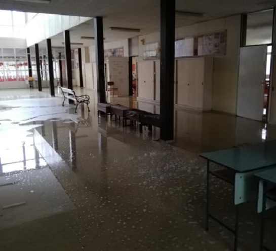 Az intézmény Facebook-oldalán olvasható bejegyzés szerint vasárnap arra kérték a dolgozókat, hogy hétfőn gumicsizmában és meleg ruhában jöjjenek dolgozni. Hétfőn képeket töltöttek fel arról, hogy áll a víz az iskola folyosóján és termeiben.