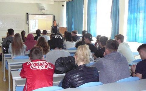 A Debreceni Rendőrkapitányság bűnmegelőzési előadója egy helyi középiskolában tájékoztatta a fiatalokat a bűnelkövetővé- és áldozattá válás elkerülésének lehetőségeiről.
