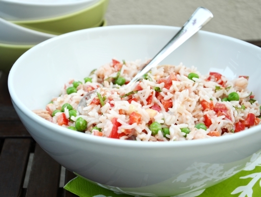 A rizst sós vízben puhára főzzük, leszűrjük, kihűtjük. A halat megsózzuk, és kevés folyadékban megpároljuk, kihűtjük, majd apróbb darabokra törjük. A gombát megtisztítjuk, kisebb kockákra vágjuk, és szintén kevés sós vízben megpároljuk, leszűrjük. A paradicsomot pár másodpercre forró vízbe dobjuk, majd lehúzzuk a héját, belső magrészét kivájjuk, és a paprikával együtt apró kockákra vágjuk. A kapribogyót és a petrezselyemzöldet finomra szeljük. Amíg a rizs és a hal párolódik, ecetes-olajos öntetet készítünk, hozzákeverjük a zöldpetrezselymet, a kapribogyót, a paradicsomot, a zöldpaprikát, a gombát, majd a megfőtt és kihűtött rizst, majd legvégül a párolt halat. Legalább három órán át hűtőszekrényben tartjuk. Tálaláskor az üvegtányérra salátalevelet teszünk, erre halmozzuk az összekevert anyagokat, petrezselyemmel díszítjük.