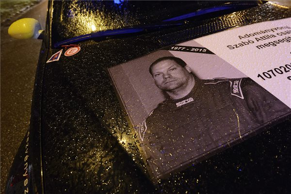 Szabó Attila fotója egy autón a rá emlékező autós felvonuláson Debrecenben 2015. március 30-án. A megemlékezők az Eger Ralin elhunyt 38 éves debreceni navigátor emlékére vonultak át a városon. Az idénynyitó versenyen, a másodosztályban versenyző Varga Csaba-Szabó Attila páros autója az utolsó gyorsasági szakaszon egy fának csapódott, a navigátor életét vesztette. MTI Fotó: Czeglédi Zsolt