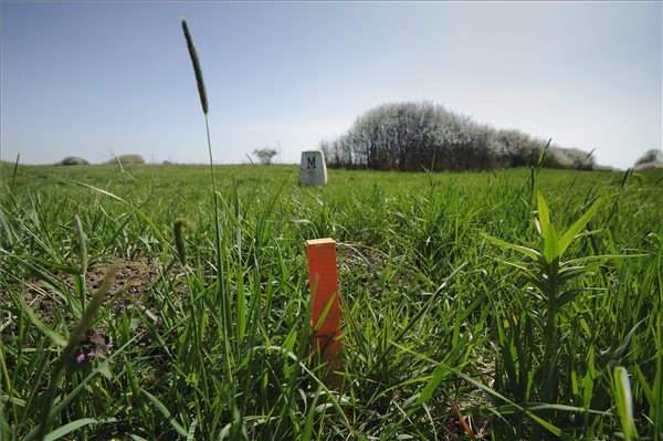 A kerítés leendő helyét jelölő piros karó a magyar-román államhatáron Berekböszörmény közelében 2016. április 5-én. Hajdú-Bihar megyében 13 településen kezdődött meg a műszaki határzár előkészítése. A határon leverték a kerítés leendő helyét jelölő piros, valamint a védelmi sáv határát jelölő zöld karókat. MTI Fotó: Czeglédi Zsolt