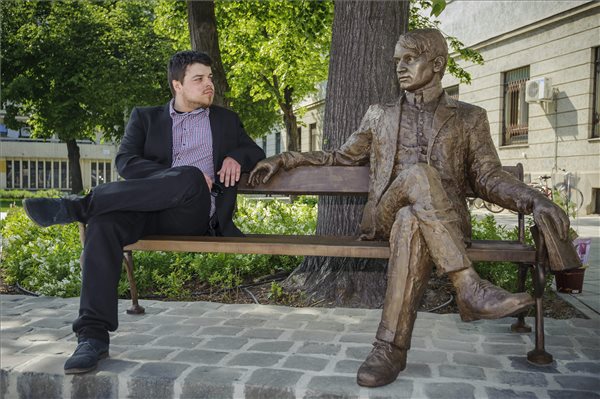 Győrfi Ádám szobrászművész alkotása, Ady Endre szobra mellett a debreceni Ady parkban az avató napján, 2016. április 28-án. MTI Fotó: Czeglédi Zsolt