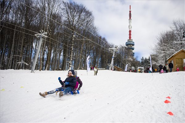 A Kékestetőn rendezett szánkóverseny résztvevői 2016. november 13-án. A Kékestetőn előző nap este este már 10 centiméteres hóréteget mért az Országos Meteorológiai Szolgálat. Emellett több soproni és más dunántúli állomás is több centiméteres hóréteget jelzett. MTI Fotó: Komka Péter