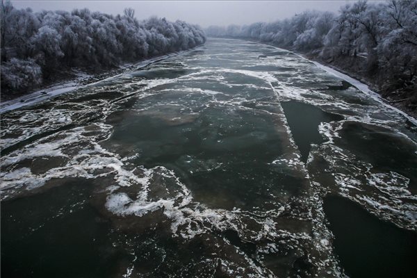 A befagyott Tisza Szolnoknál 2017. január 2-án. MTI Fotó: Bugány János.