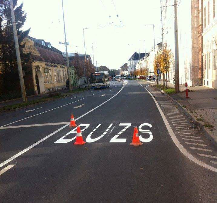 Az épp megújuló Széchenyi utca buszsávját elsőre nem sikerült tökéletesen megfesteni.Debreceni facebookos csoportokban terjedt ez a fotó, ami durva elírást rögzített az utókor számára: