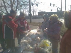 Az ingyenes ételosztáson egy tál meleg ebéddel, forró teával vártunk minden rászorulót. A metsző hideg (mínusz hét fok), a nagy szél ellenére jóval több mint száz embertársunk állt a sorban a töltött káposztáért, a friss kenyérért. A kegyetlen