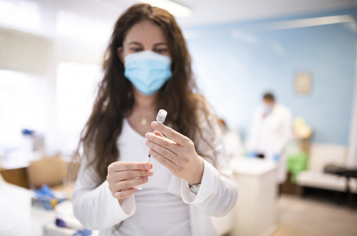 A fotón azt láthatjuk, ahogy Sipos Renáta asszisztens előkészíti oltáshoz a Pfizer-BioNTech koronavírus elleni vakcinát a Jósa András Oktatókórházban kialakított oltóponton március 28-án vasárnap.