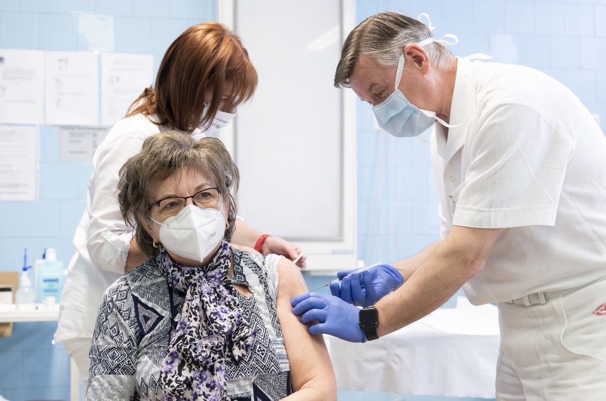 Lakatos István idegsebész főorvos beolt egy nőt a német-amerikai fejlesztésű Pfizer-BioNTech koronavírus elleni oltóanyag, a Comirnaty-vakcina második adagjával a Jósa András Oktatókórházban kialakított oltóponton 2021. április 30-án.