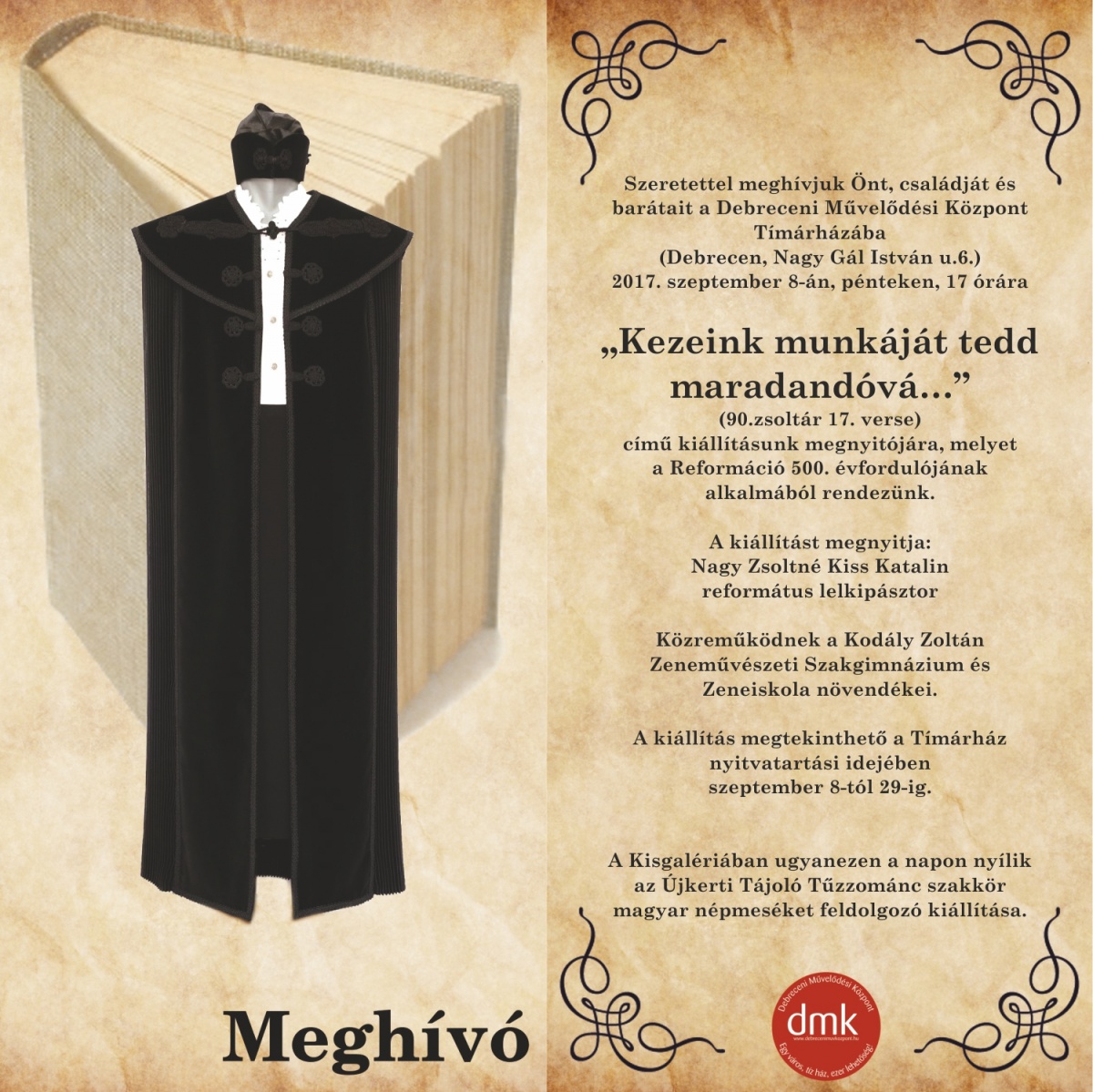 „Kezeink munkáját tedd maradandóvá…” címmel a Reformáció 500. éve alkalmából vallásos témájú népművészeti kiállítás nyílik szeptember 8-án, pénteken, 17 órakor kerámiákból, viseletekből, hímzésekből a DMK Tímárház – Kézművesek Házában (Nagy Gál I. u. 6.). A kiállítást megnyitja: Nagy Zsoltné Kiss Katalin református lelkipásztor.