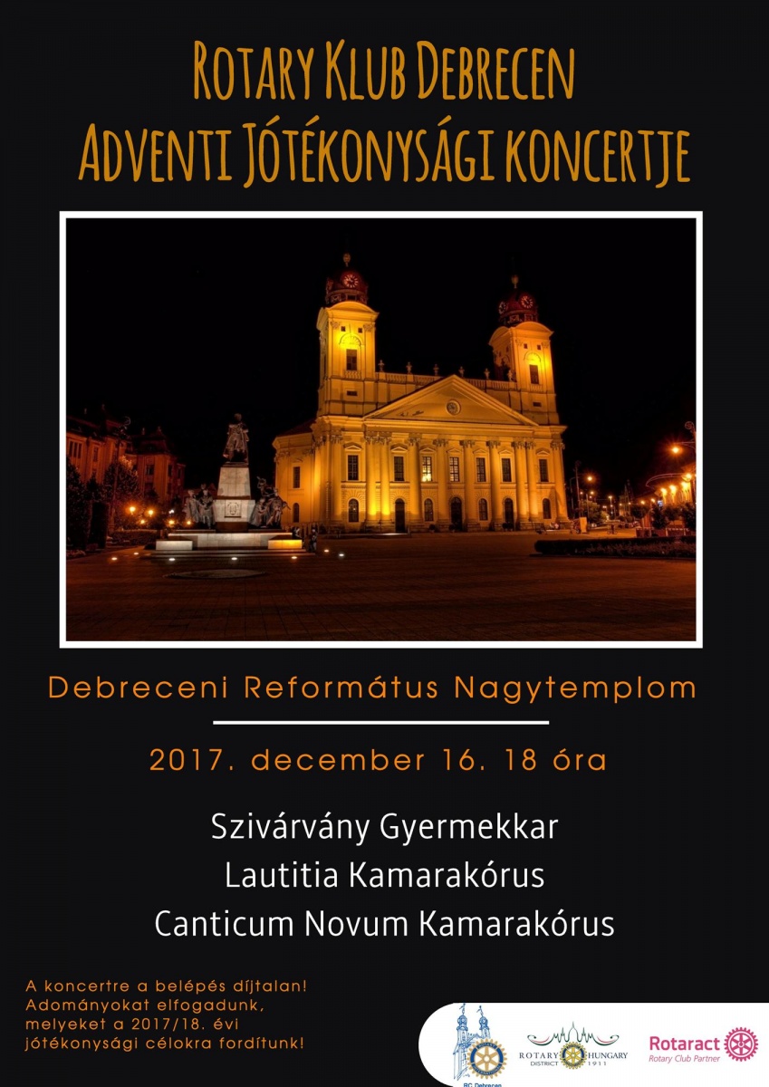 2017. december 16-án (szombaton) 18 órától tartja Adventi jótékonysági koncertjét a Rotary Klub a Debreceni Református Nagytemplomban. Az ünnepi alkalmon köszöntőt mond Palánki Ferenc római katolikus megyés püspök, Derencsényi István, a Tiszántúli Református Egyházkerület főjegyzője, valamint Dr. Kiss Miklós, a debreceni Rotary Klub elnöke. A jótékonysági koncerten közreműködik Kun Rajmund (orgona), a Szivárvány Gyermekkar, a Lautitia Kamarakórus és a Canticum Novum Kamarakórus. A belépés díjtalan.