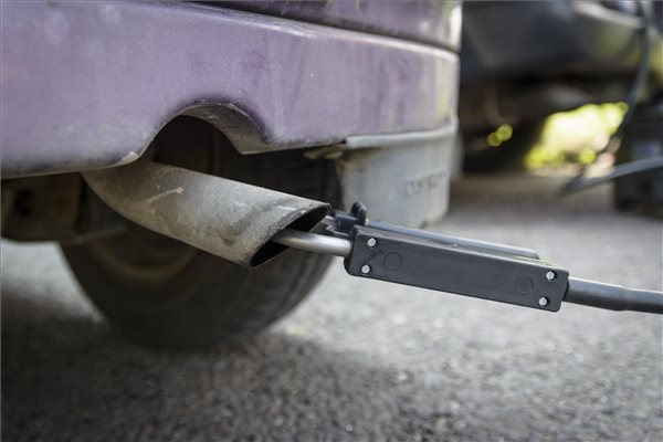 A Nemzeti Közlekedési Hatóság és a rendőrség munkatársai egy jármű károsanyag-kibocsátását mérik Debrecenben, a Balmazújvárosi úton 2014. szeptember 15-én. Ezen a héten Budapest mellett három nagyvárosban, Debrecenben, Győrött és Szegeden ellenőrzik az autók környezetvédelmi állapotát. MTI Fotó: Czeglédi Zsolt