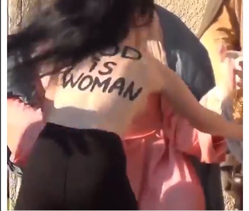A Femen csoport közlése szerint az illető neve Alisa Vinogradova. Testére azt írták, hogy “Isten nő”, és ezt kiabálta az “akció” közben is.